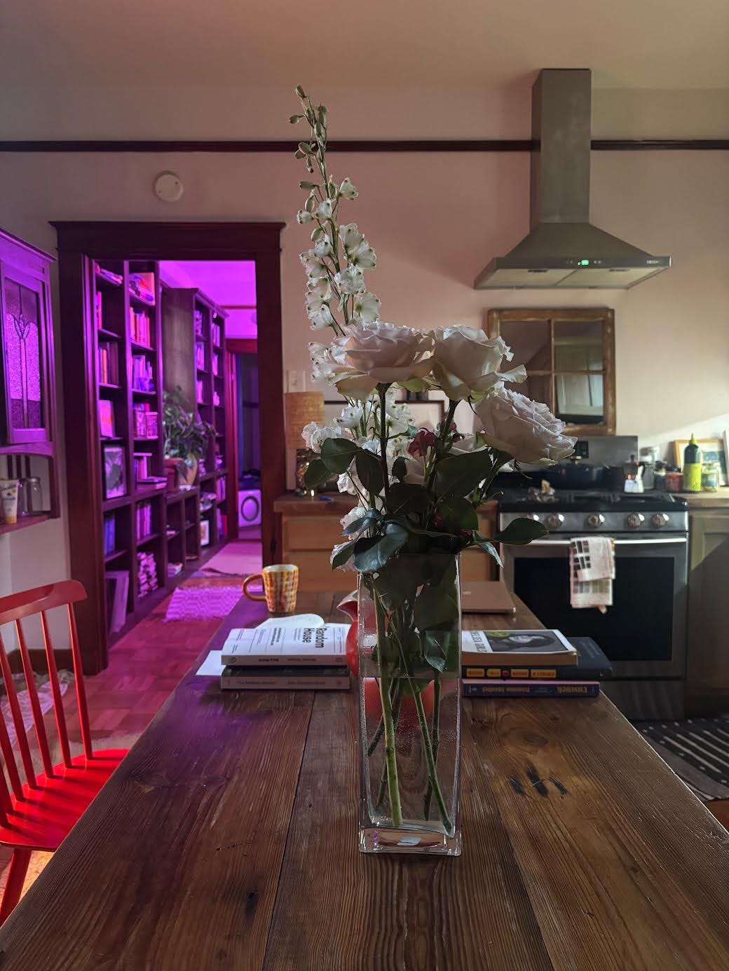Back at my house, I saw my neighbor at his truck, plucking flowers from the display, disassembling it, and then clipping the ends off the flowers. “What you got there?” I said, hoping for a story, but also just happy to hear the sounds of voices in real life, and not just from a speaker. He told me he worked weddings sometimes at a backyard venue in the neighborhood and a florist had forgotten to take this display. He was making bouquets for his roommates and friends. He told me to take some and then insisted I take more. “There’s plenty,” he said.