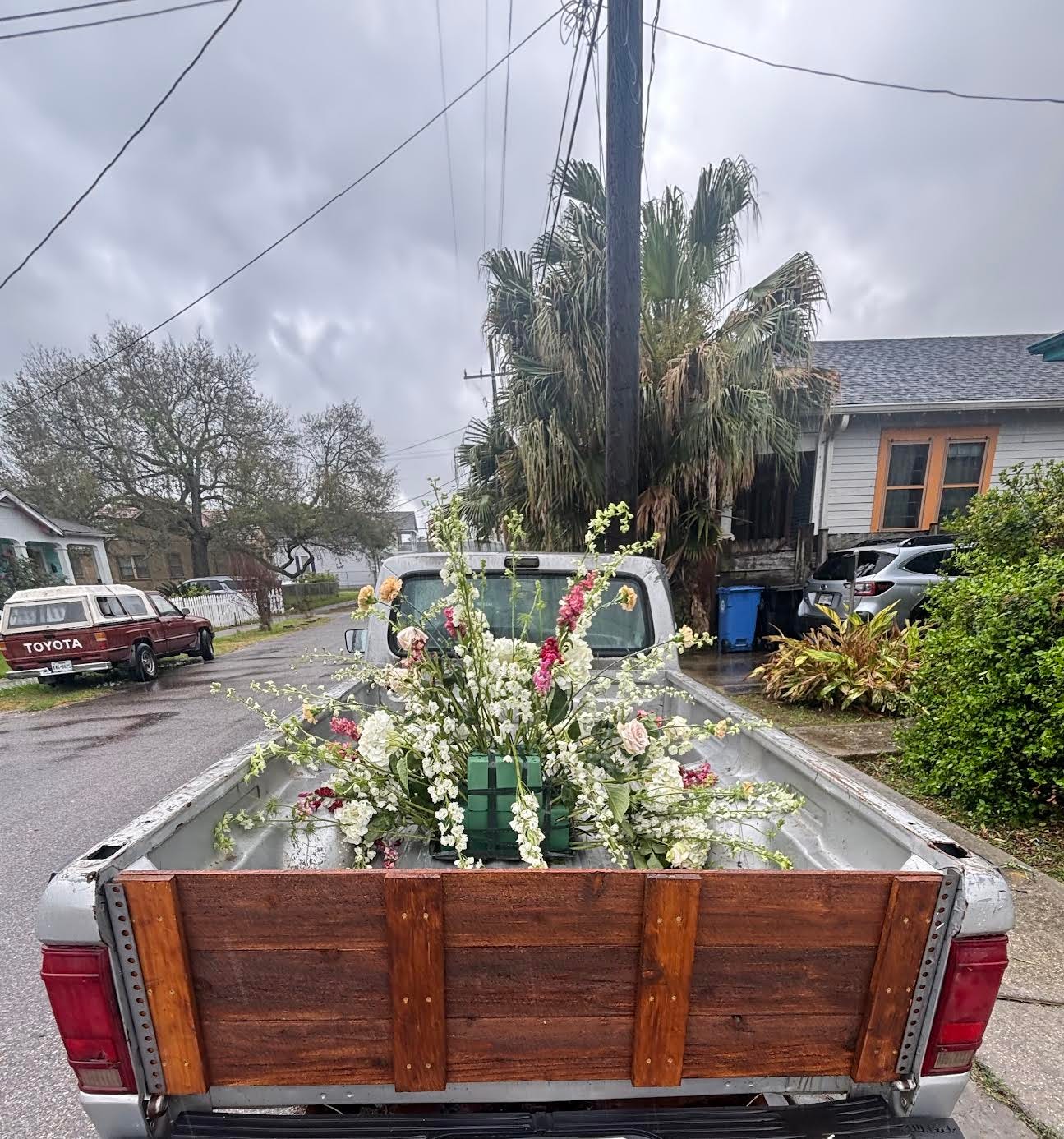 In the early afternoon I wistfully looked outside, wondering when it would stop raining, and it was then I spotted an enormous display of flowers in the back of my neighbor’s truck. I wondered if he had a party he was going to—or was coming from. Thought maybe I’d use it as a detail in a story one day, the enormous floral display in the rain, in the back of a pickup.